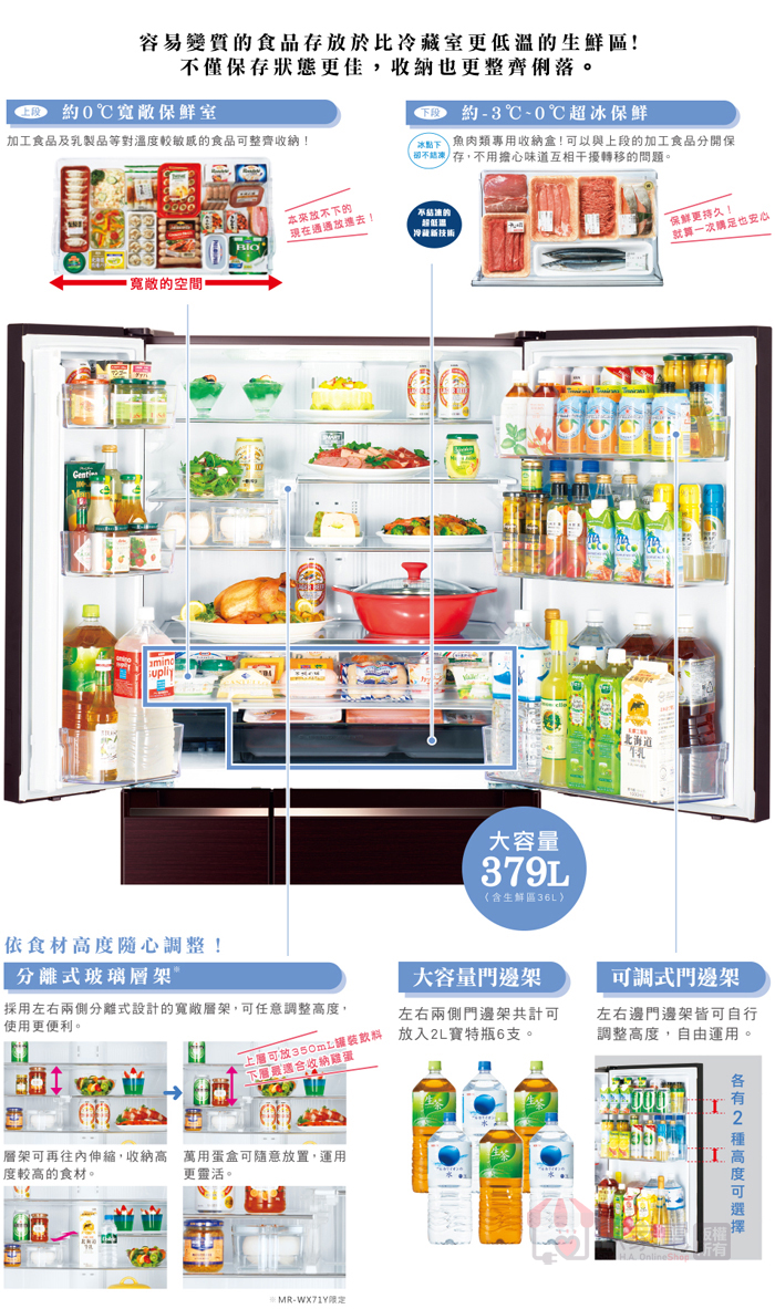 升降棚架、伸縮層架、智慧監測冷流、水嫩冷藏、可側取門邊架、可調式門邊架、2L寶特瓶(5瓶)、儲水槽