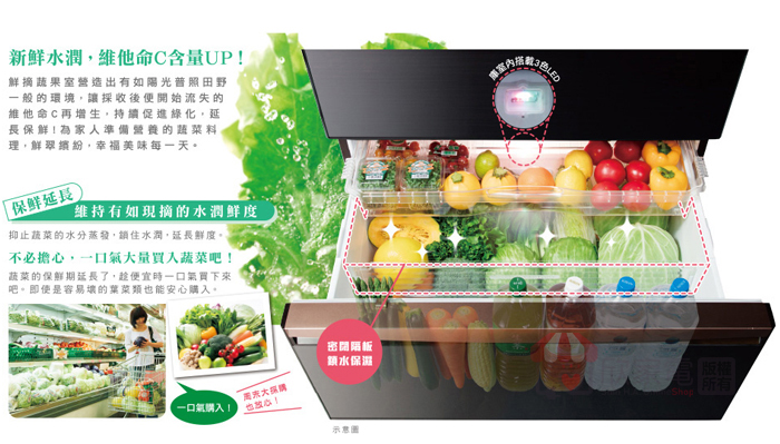 新鮮保存、鮮摘蔬果室、獨立溫度調節、一拉到底全開抽屜、輕鬆滑軌、2L寶特瓶(6瓶)