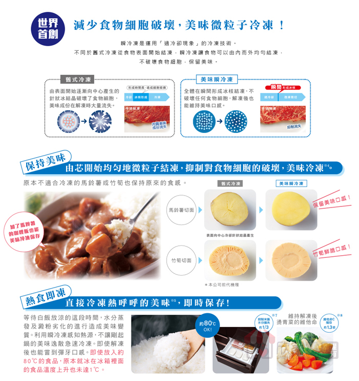 瞬冷凍易切(瞬冷凍)、微凍易切、熱食即凍、溫度切換(微凍易切/冷凍)、鋁製托盤