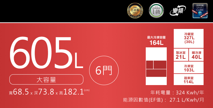 容量:605L (冷藏 327L/製冰 21L/瞬冷凍 40L/冷凍 103L/蔬果 114L)