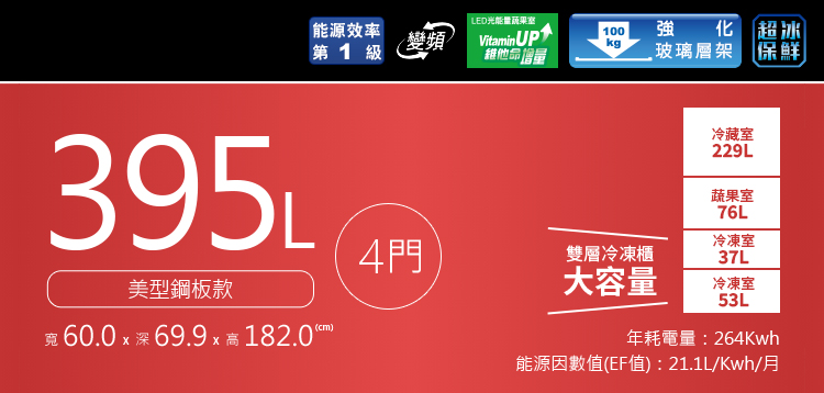 容量:395L (冷藏 229L/蔬果 76L/冷凍 37L/冷凍 53L)