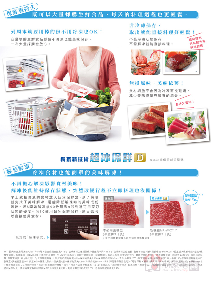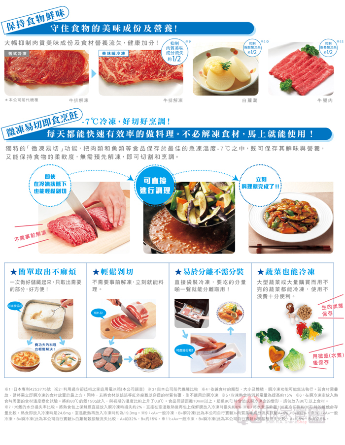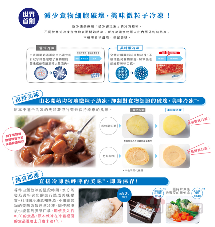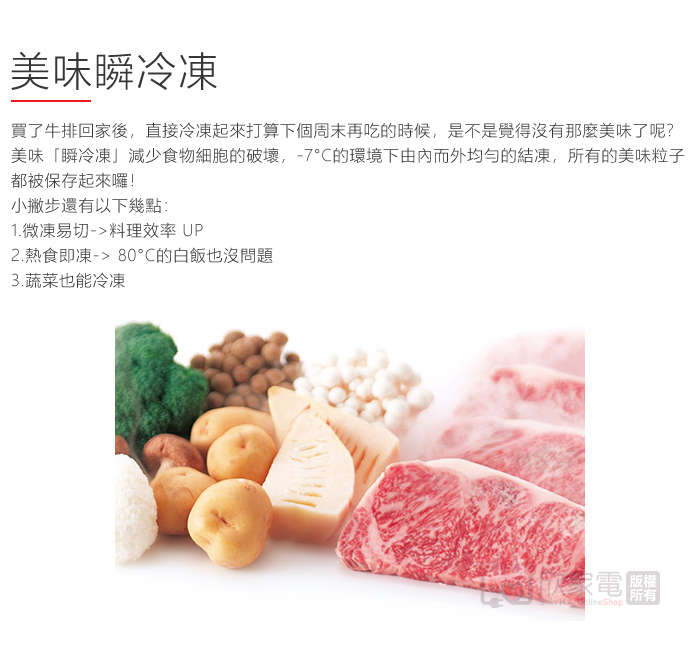 美味瞬冷凍、微凍易切、熱食即凍、溫度切換(微凍易切/冷凍)、鋁製托盤