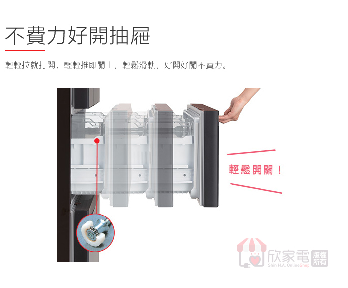 快速冷凍、預冷運轉、輕鬆滑軌、一拉到底全開抽屜