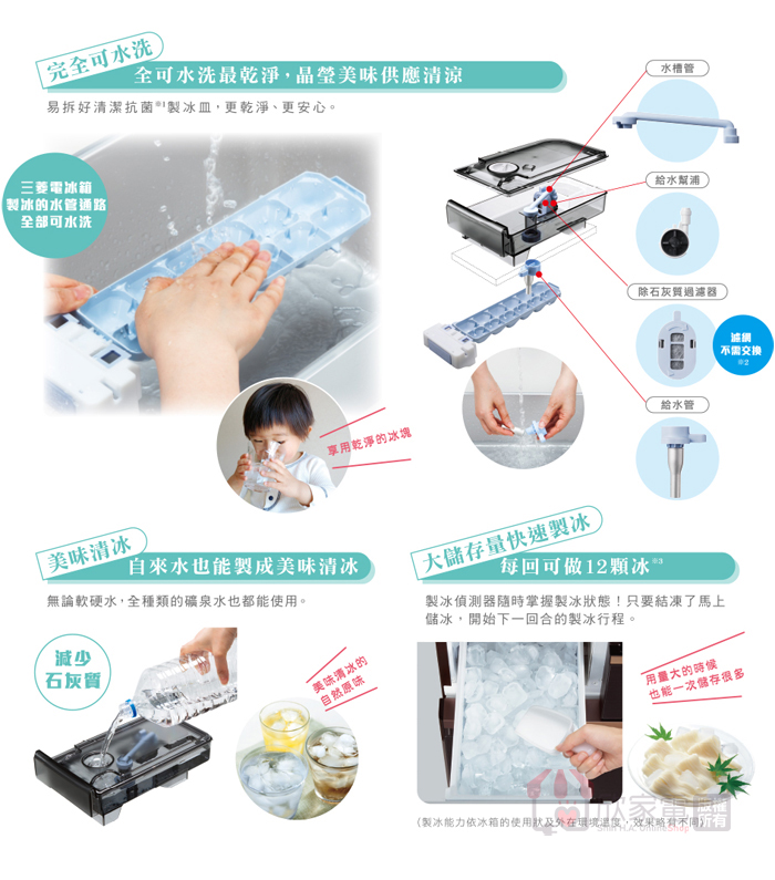 超淨清冰、給水管路可水洗、抗菌全可洗製冰皿、直接給水式自動製冰、急速製冰模式