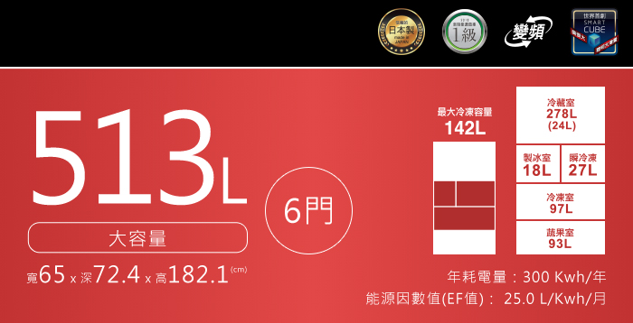容量:513L (冷藏 278L/製冰 18L/瞬冷凍 27L/冷凍 97L/蔬果 93L)