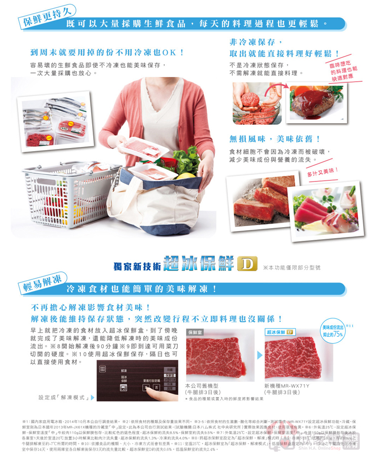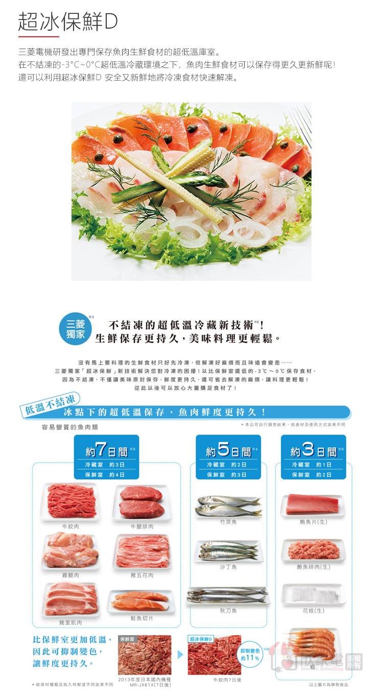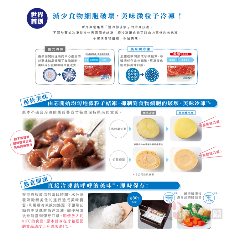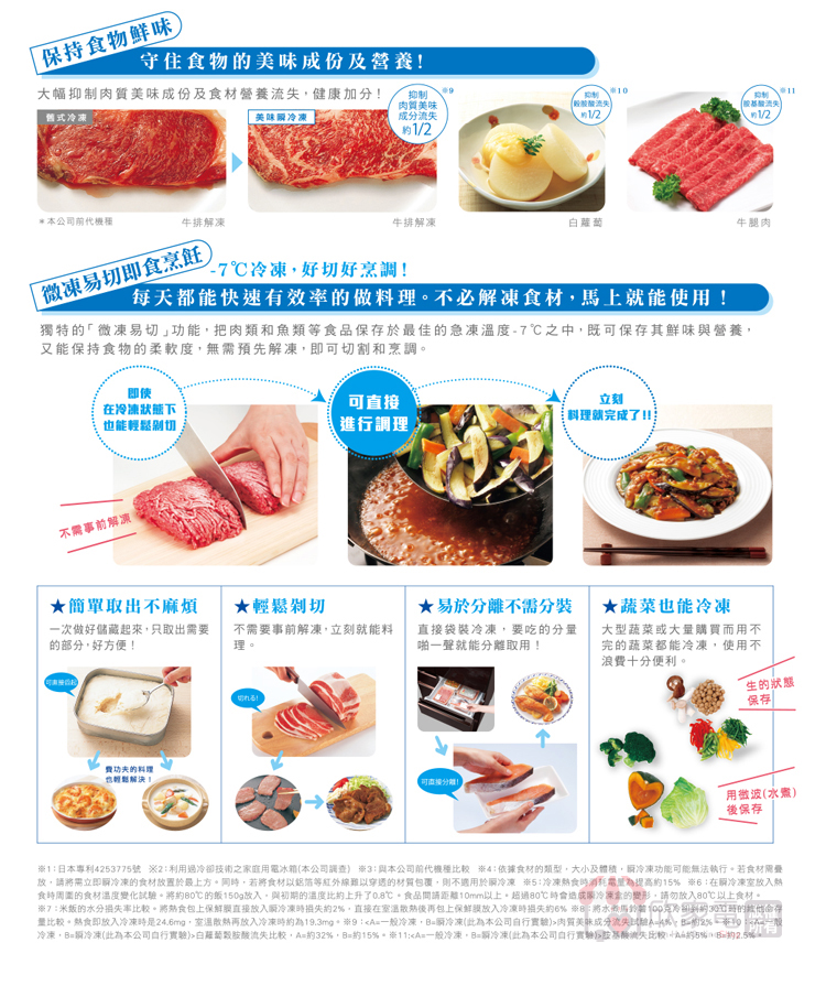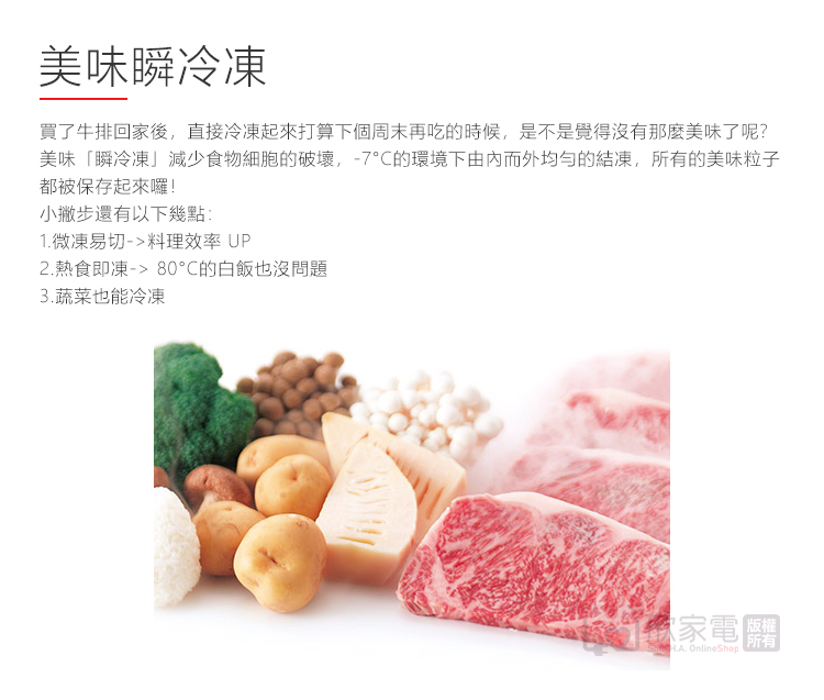 美味瞬冷凍、微凍易切、熱食即凍、溫度切換(微凍易切/冷凍)、鋁製托盤