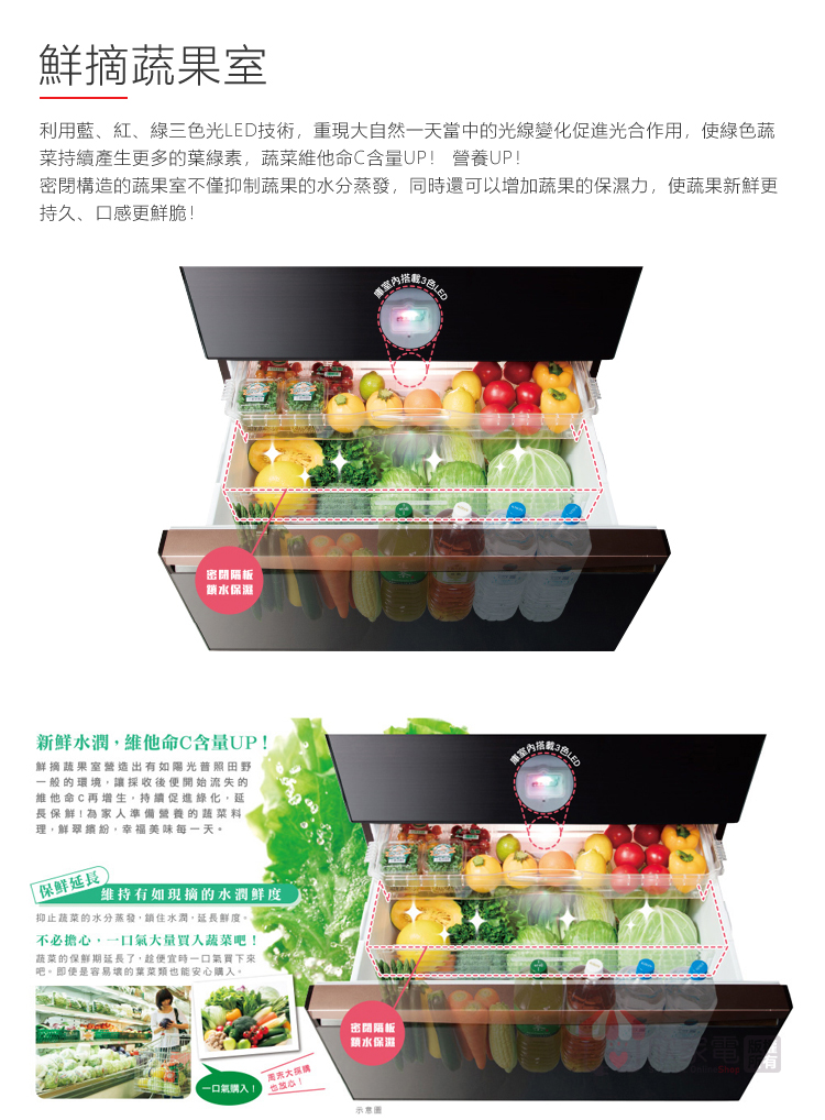 鮮摘蔬果室、獨立溫度調節、一拉到底全開抽屜、輕鬆滑軌