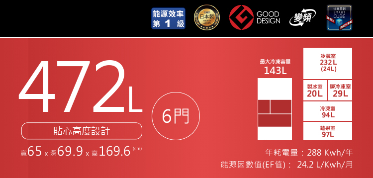 容量:472L (冷藏 232L/製冰 20L/瞬冷凍 29L/冷凍 94L/蔬果 97L)