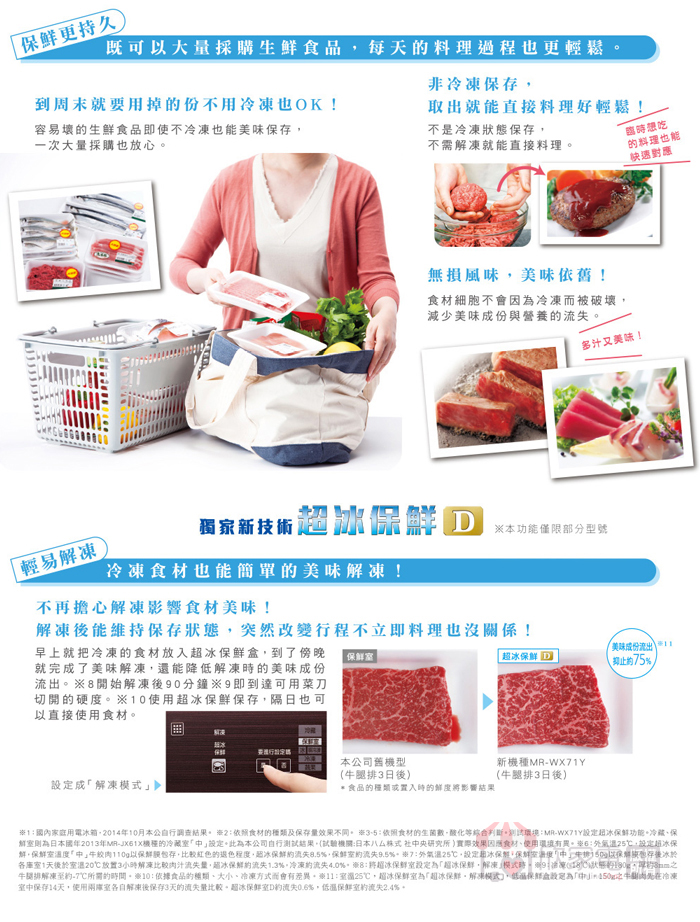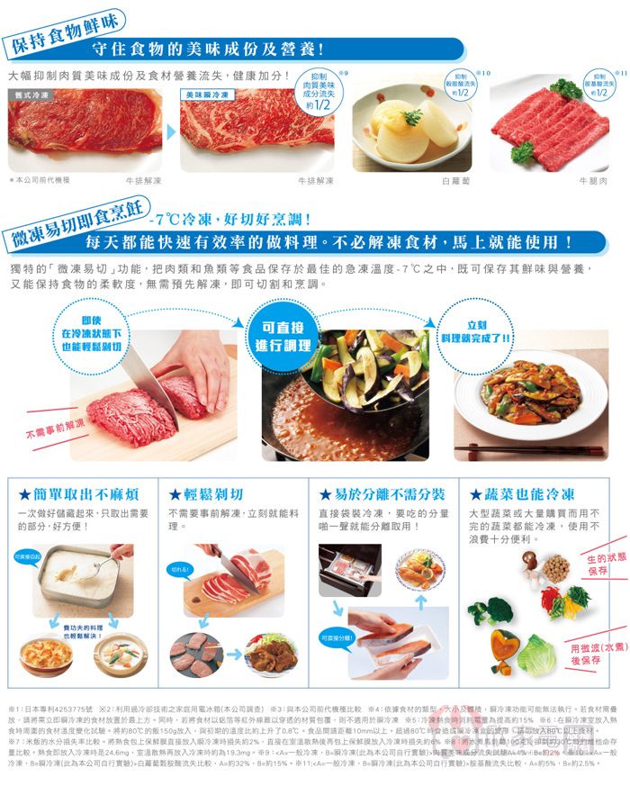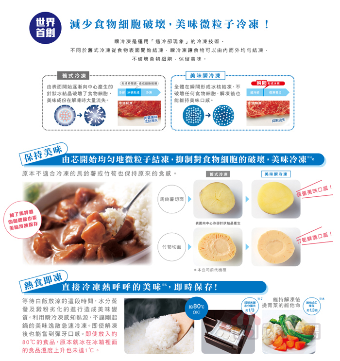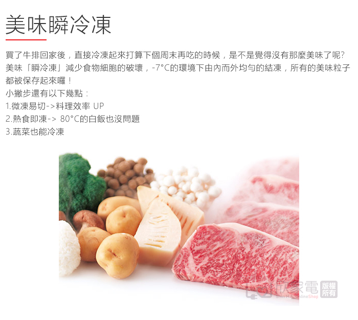 美味瞬冷凍、微凍易切、熱食即凍、溫度切換(微凍易切/美味瞬冷凍)、鋁製托盤