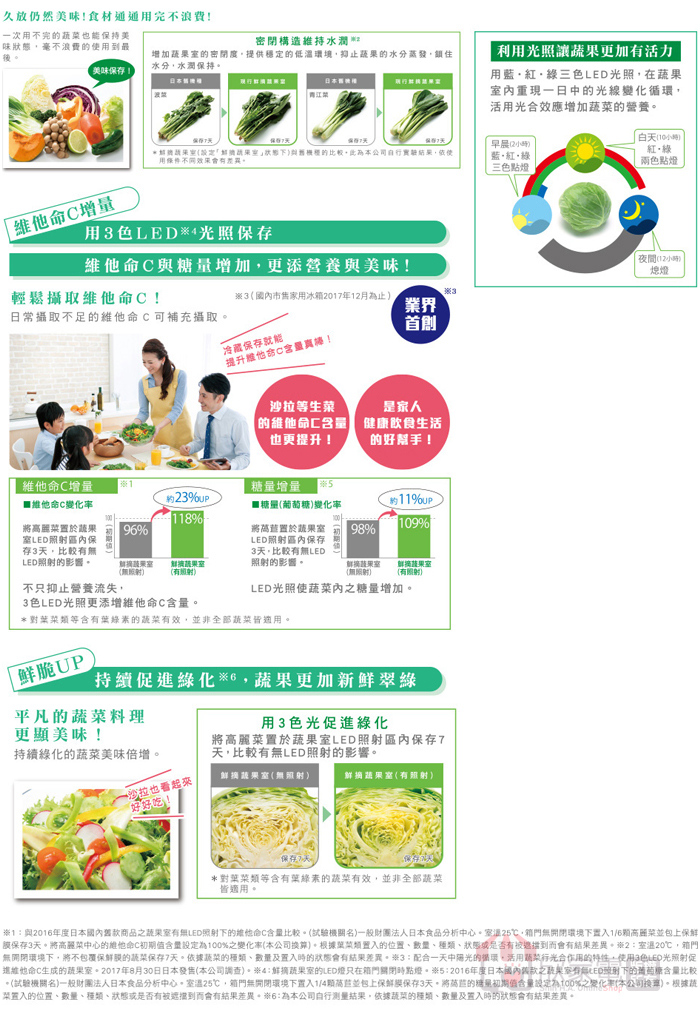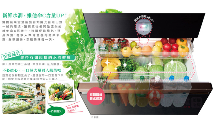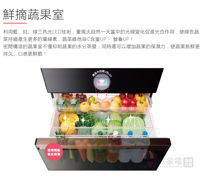 鮮摘蔬果室、獨立溫度調節、一拉到底全開抽屜、輕鬆滑軌