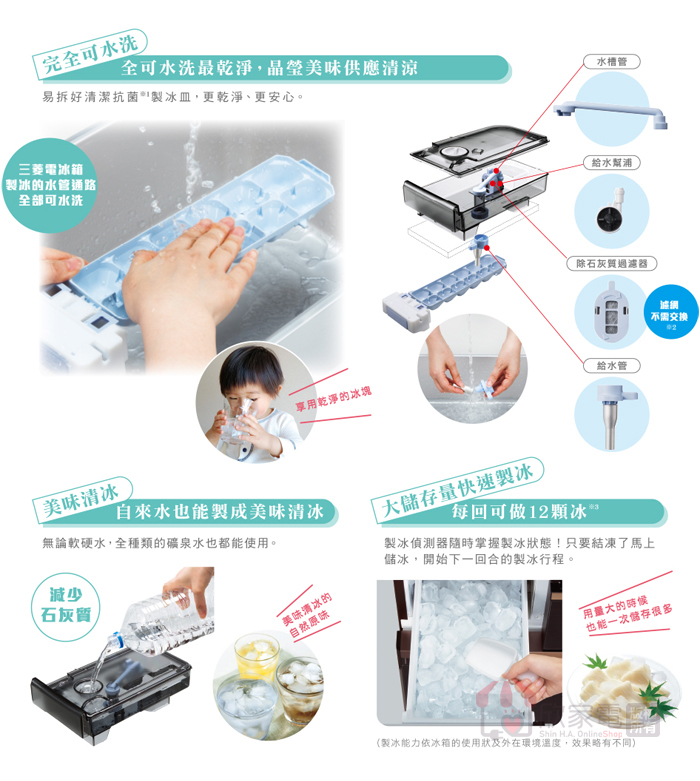 全可洗超淨清冰、抗菌全可洗製冰盒、給水管路可水洗、直接給水式自動製冰