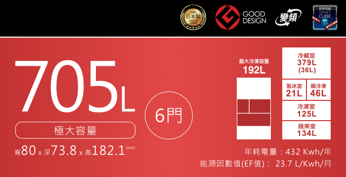 容量:705L (冷藏 379L/製冰 21L/瞬冷凍 46L/冷凍 125L/蔬果 134L)