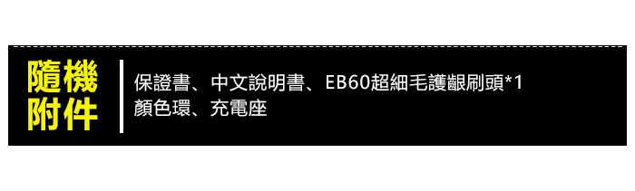 附屬品:保證書、中文說明書、EB60超細毛護齦刷頭、顏色環、充電座