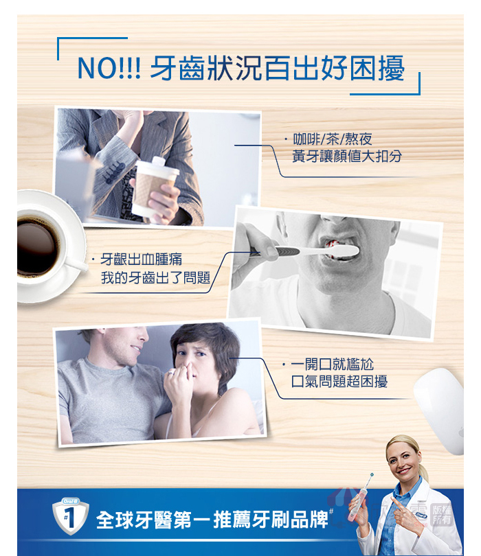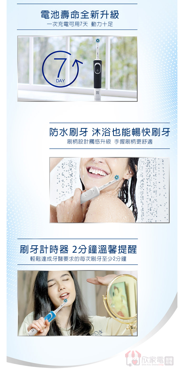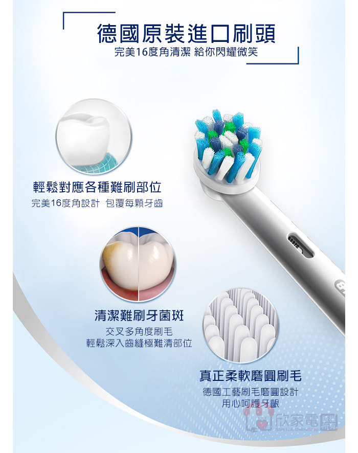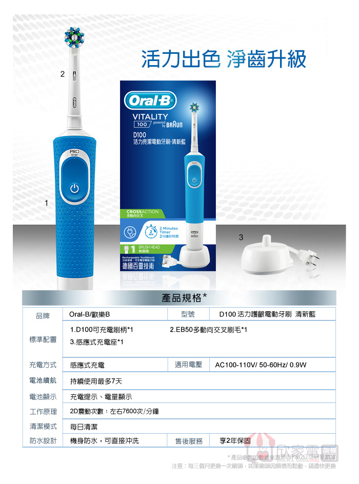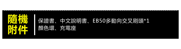 附屬品:保證書、中文說明書、EB50多動向交叉刷頭*1、顏色環、充電座