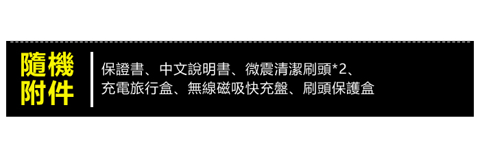 配件:保證書、中文說明書、微震清潔刷頭*2、充電旅行盒、無線磁吸快充盤、刷頭保護盒