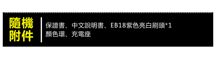 附屬品:保證書、中文說明書、EB18紫色亮白刷頭*1、顏色環、充電座