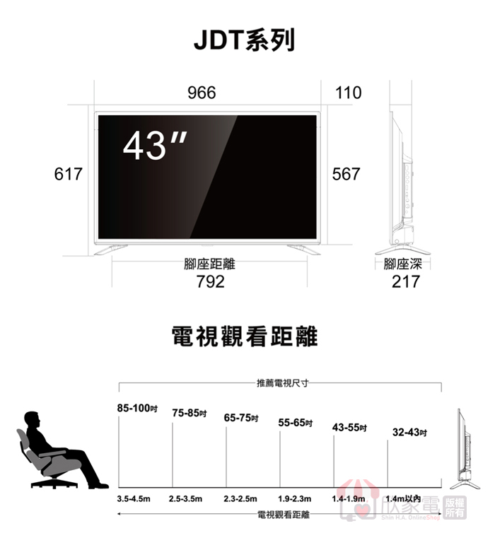 外觀尺寸(寬×深×高)mm含腳座 W×D×H (mm):966 x 217 x 617 mm