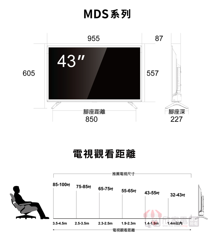 外觀尺寸 (寬x深x高)mm含脚座 W x D x H (mm):955x227x605mm