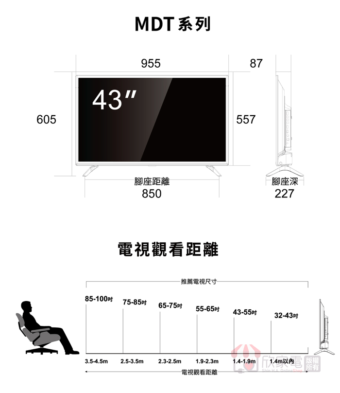 外觀尺寸 (寬x深x高)mm無腳座 W x D x H (mm):955x87x557mm