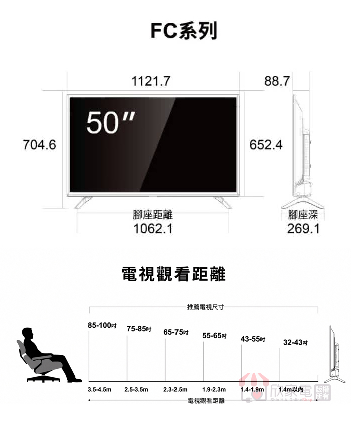外觀尺寸(寬×深×高)mm含腳座 W×D×H (mm):1121.7 × 269.1 × 704.66 mm
