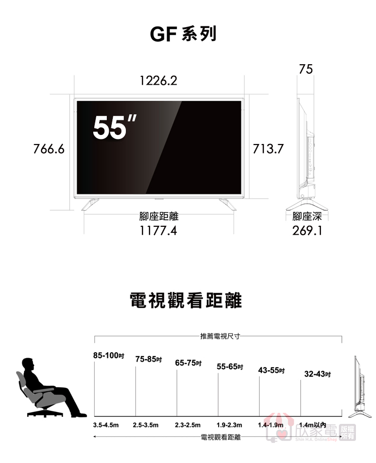 外觀尺寸 (寬x深x高) mm 含腳座 WxDxH (mm):1226.2x269.1x766.6 mm