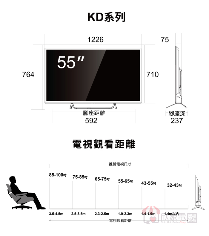 外觀尺寸(寬×深×高)mm含腳座 W×D×H (mm):1226 x 237 x 764 mm