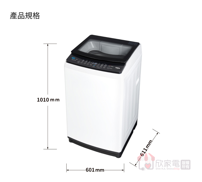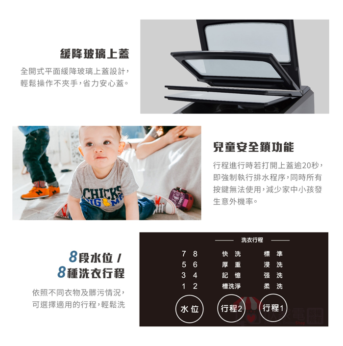 洗衣行程選擇:8種 (標準、浸洗、強洗、柔洗、快洗、厚重、記憶、槽洗淨)