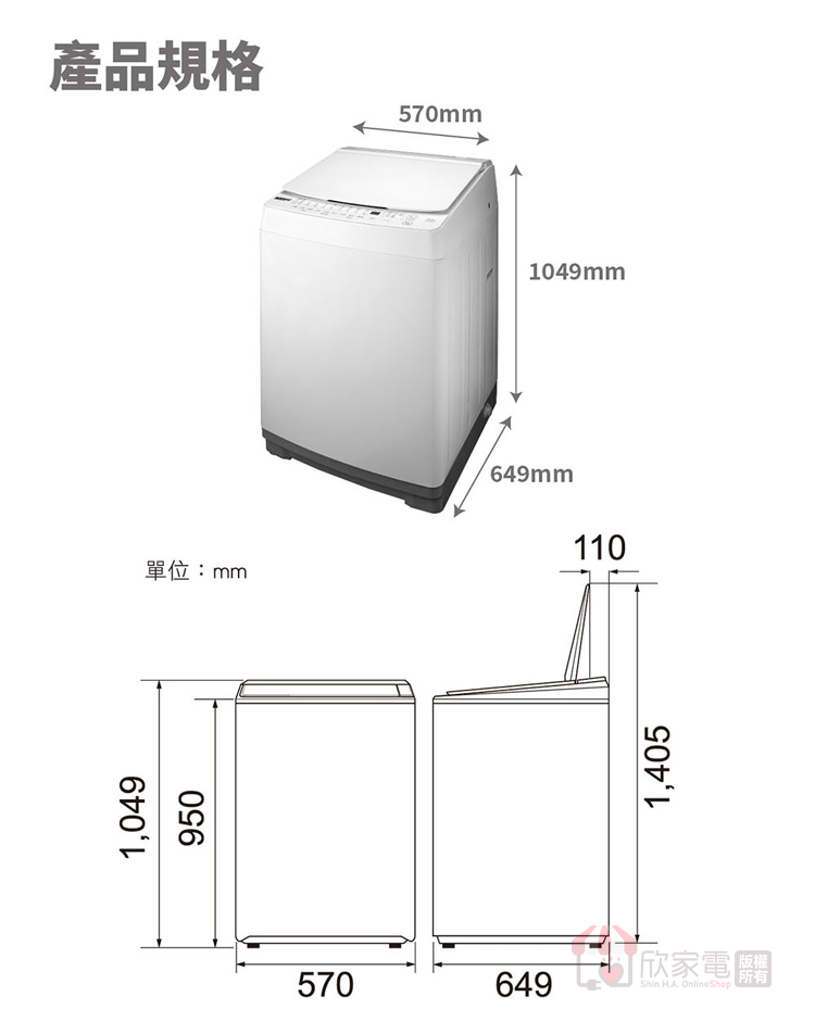 機體尺寸:寬570 × 高1049 × 深649 mm