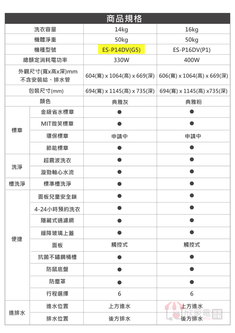 最大洗衣/脫水重量:14 kg