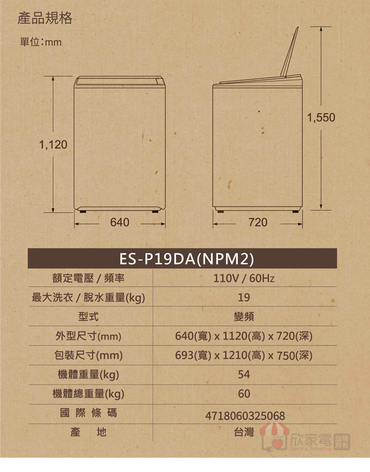 外觀尺寸:W642 × H1120 × D720 (mm)/上蓋開啓時 W642 × H1550 × D720 (mm)