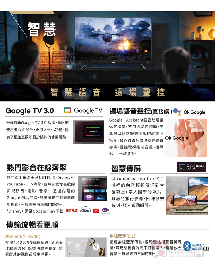 遠場語音:遠場語音(直接講OKGoogle,免按遙控器)