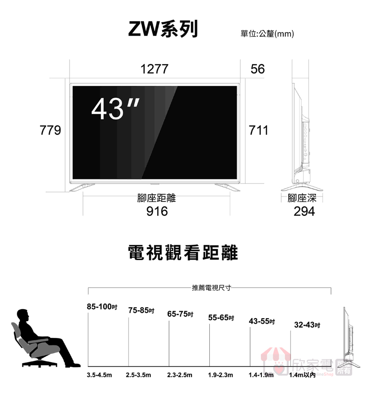 底座尺寸/兩底座距離(寬×深) W x D (mm):916 x 294 mm