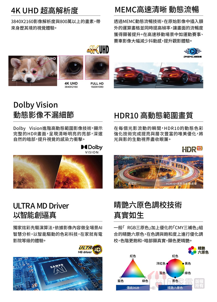 高動態範圍畫質 USB/HDMI:杜比視界 (Dolby Vision)、HDR10、HLG