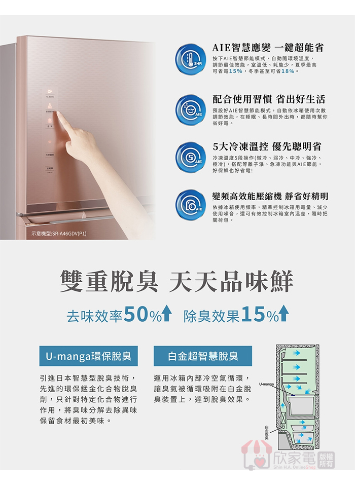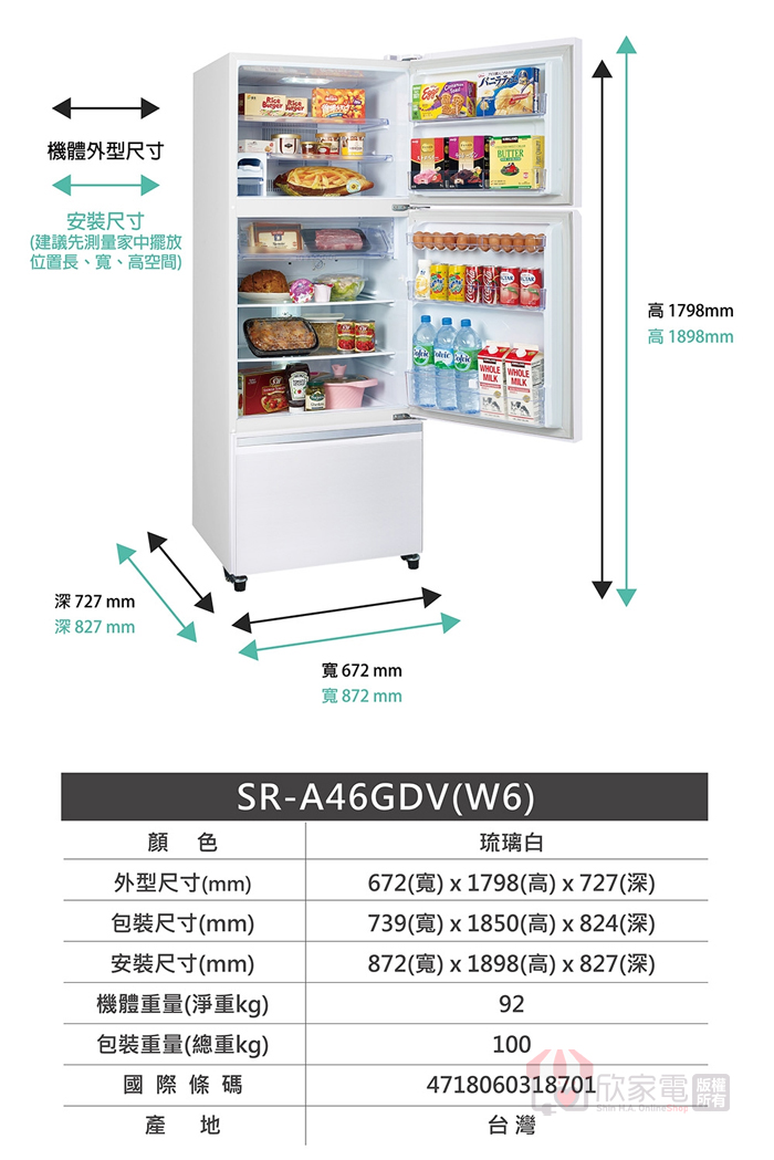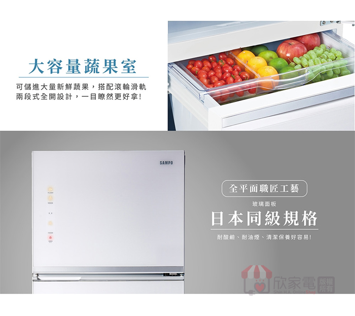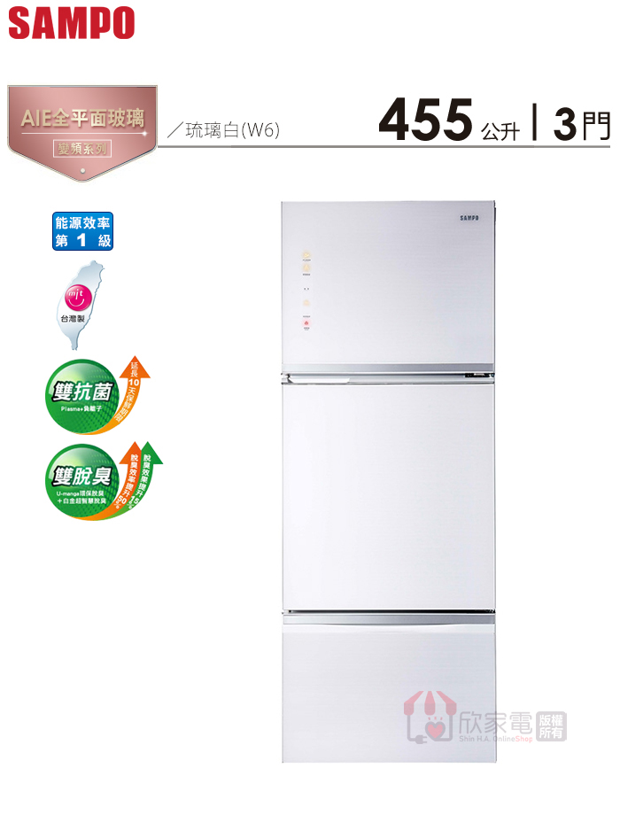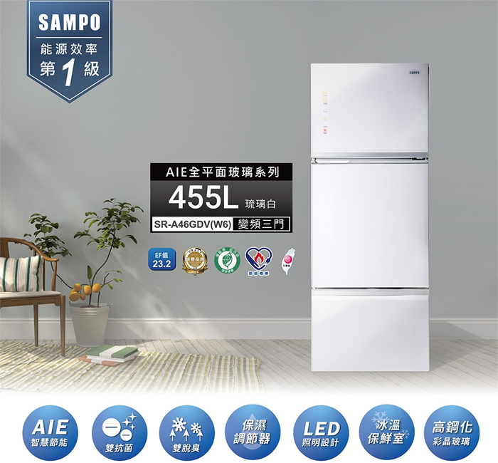 SAMPO 聲寶 455公升 AIE全平面玻璃系列鈦變頻三門冰箱 -琉璃白