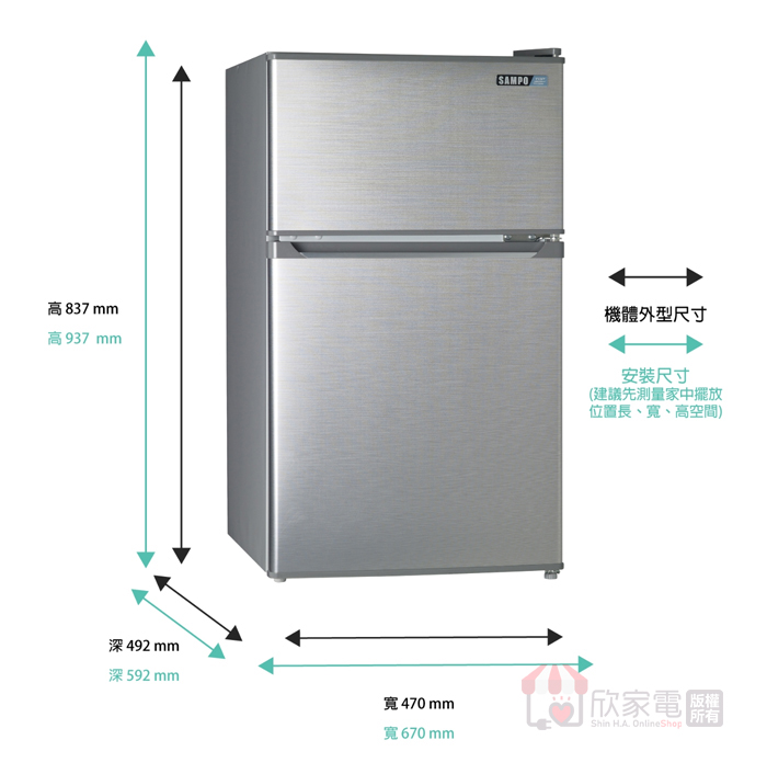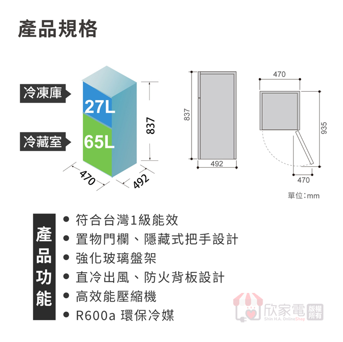 有效內容積(L):92 (冷凍 27/冷藏 65)