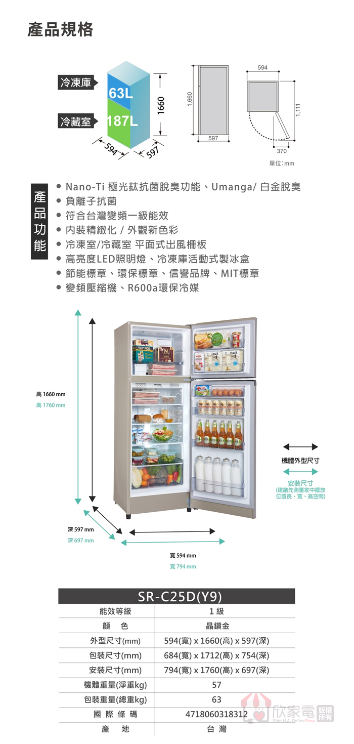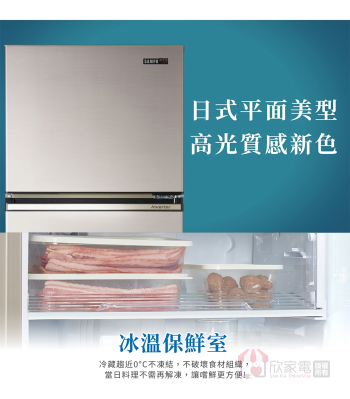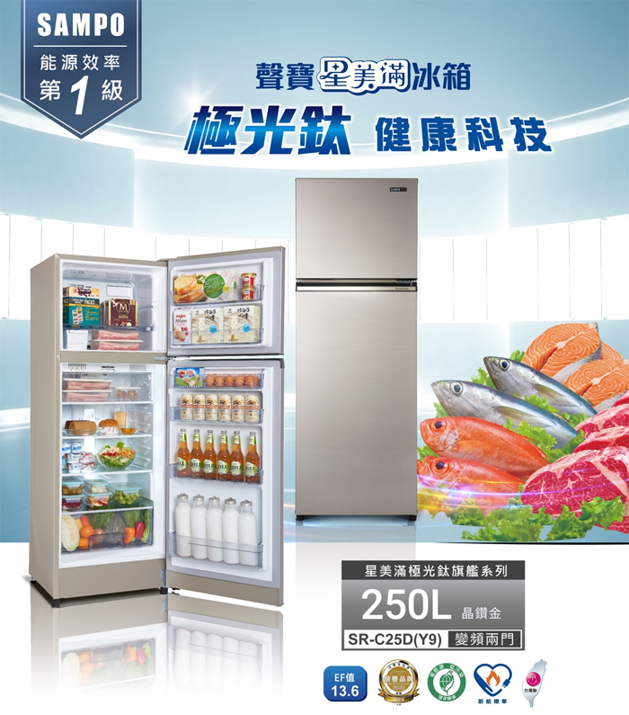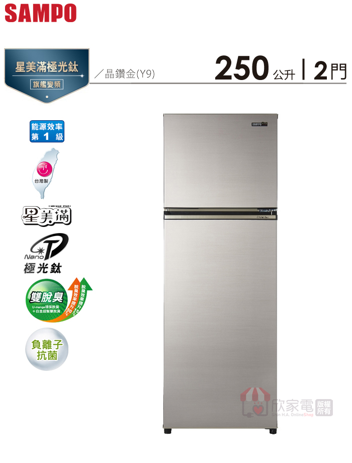SAMPO 聲寶 250公升 星美滿極光鈦變頻雙門冰箱 -晶鑽金