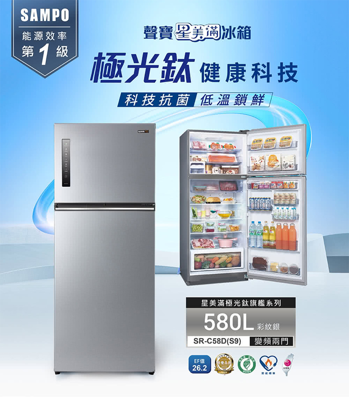 SAMPO 聲寶 580公升 星美滿極光鈦變頻雙門冰箱 -彩紋銀