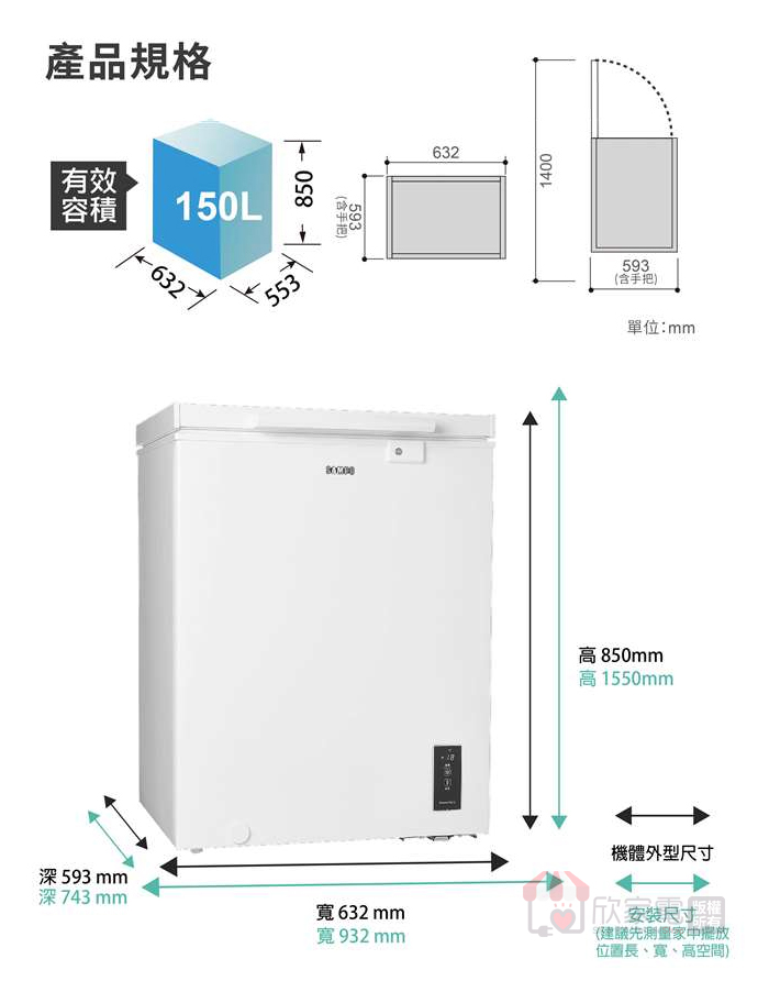 外型尺寸(含把手)(mm):寬632 × 高850 × 深593