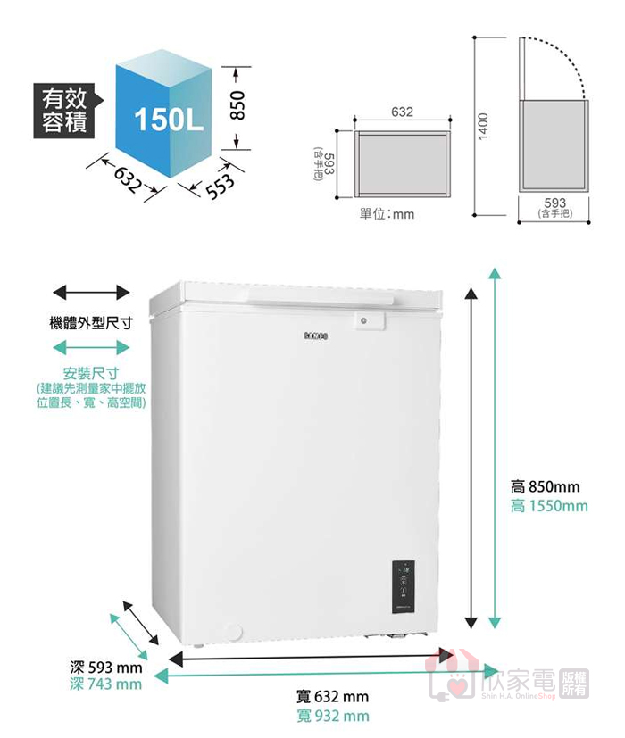 外型尺寸(含把手)(mm):寬816 × 高850 × 深593