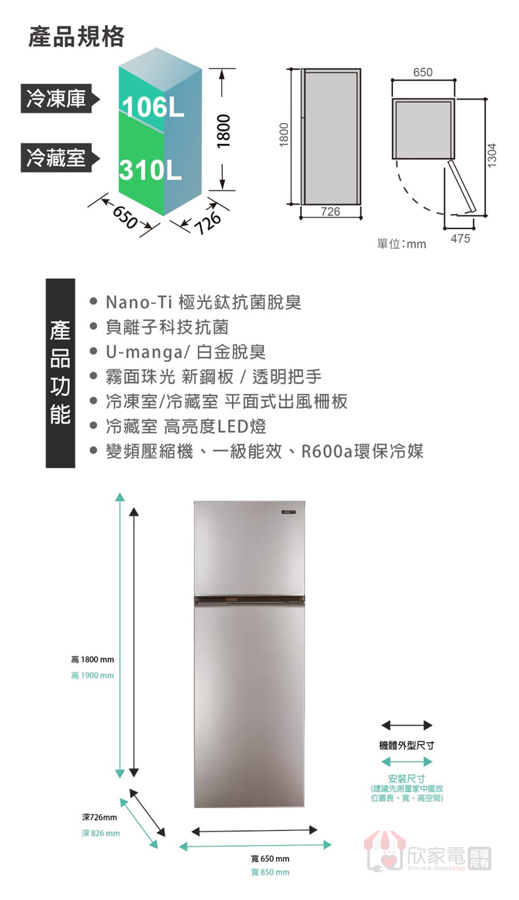 外型尺寸(寬x高x深mm):650 × 1800 × 726