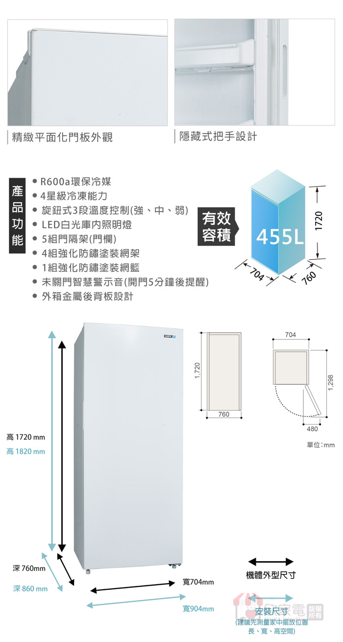 外型尺寸(mm):寬704 × 高1720 × 深760(含把手)