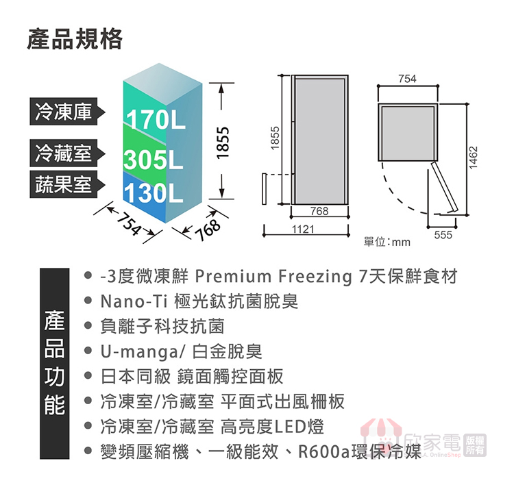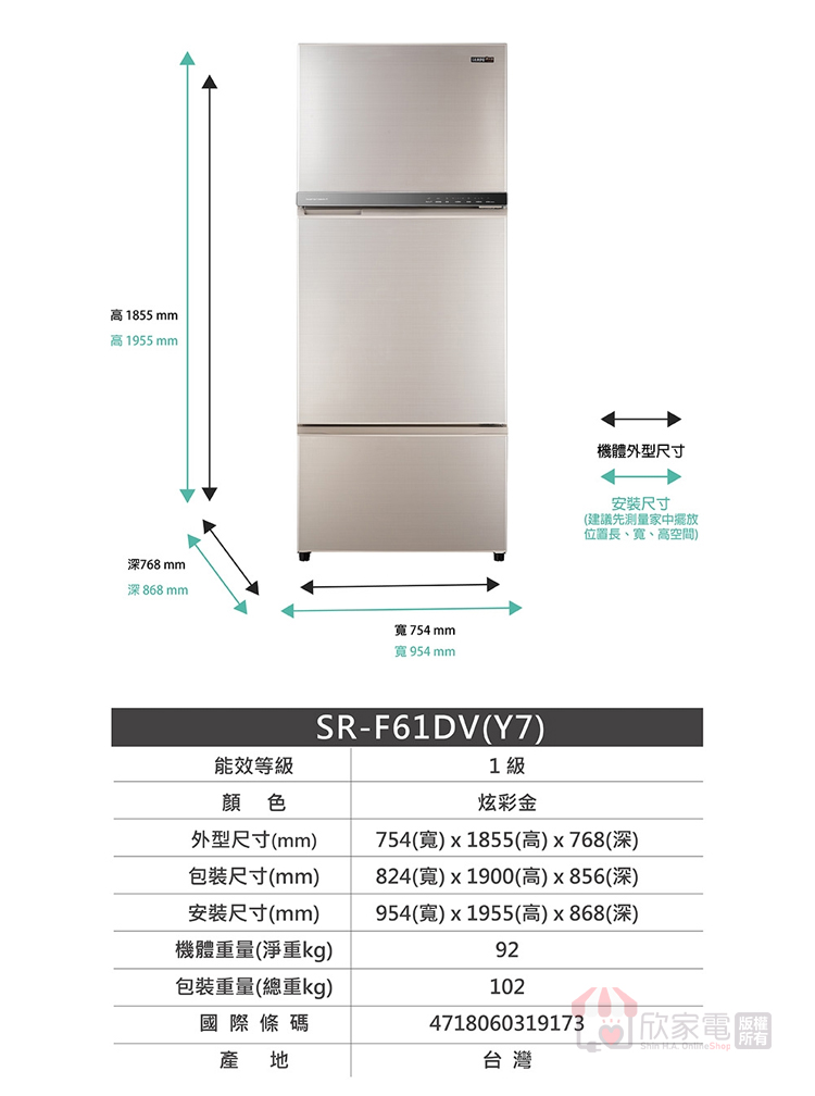 外型尺寸(mm):寬754 × 高1855 × 深768
