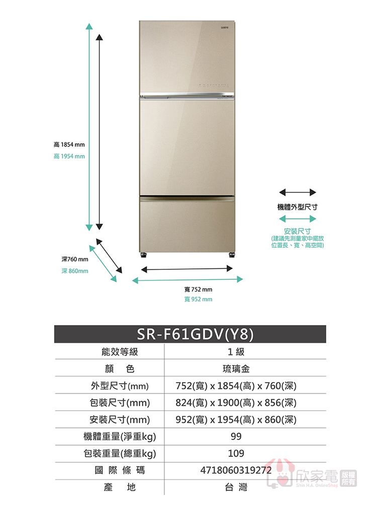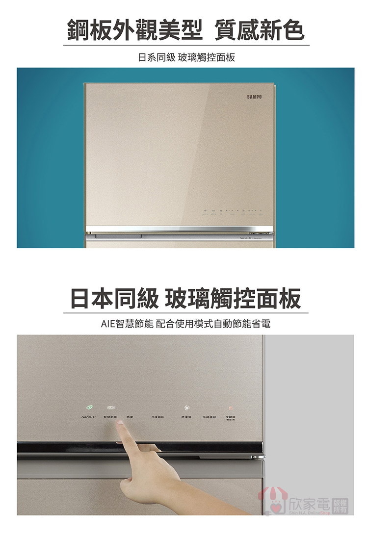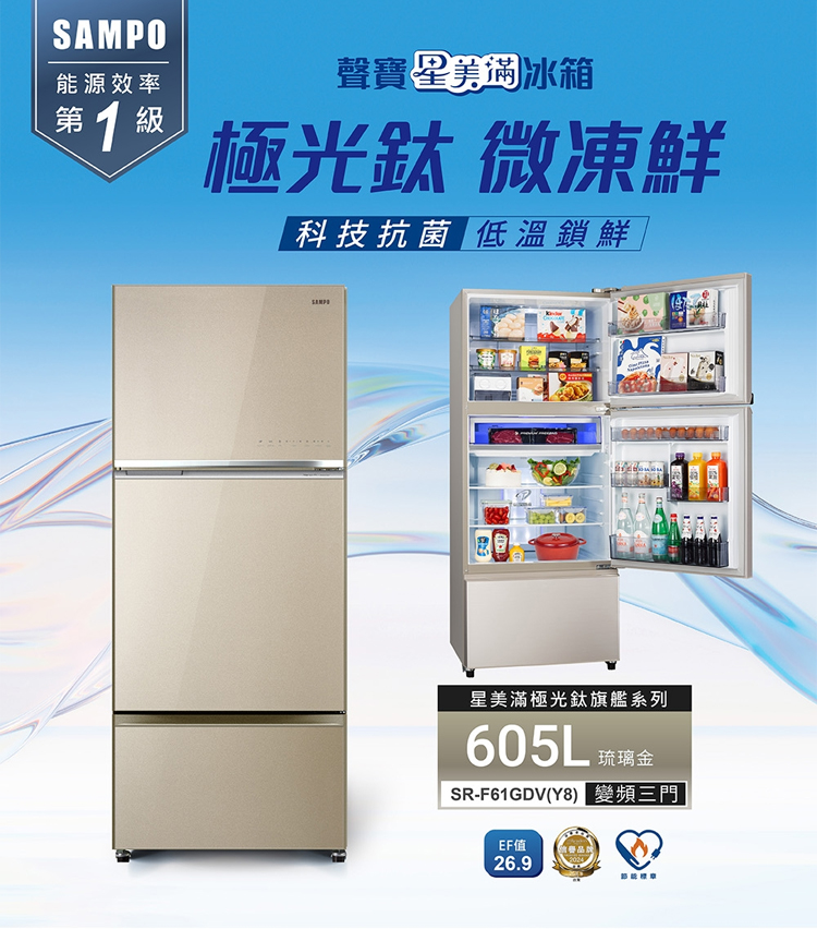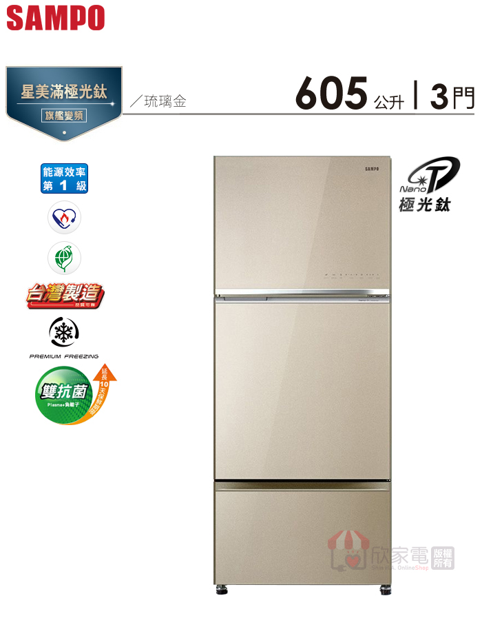 SAMPO 聲寶 605公升 星美滿極光鈦變頻三門冰箱 -琉璃金