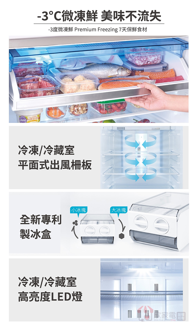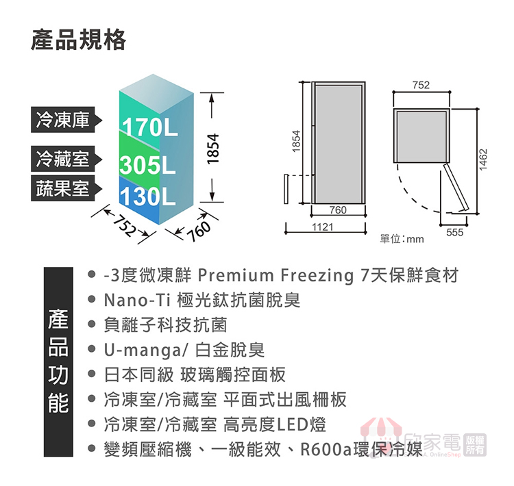 冷凍庫/冷藏室/蔬菜室有效內容積(L):170/305/130