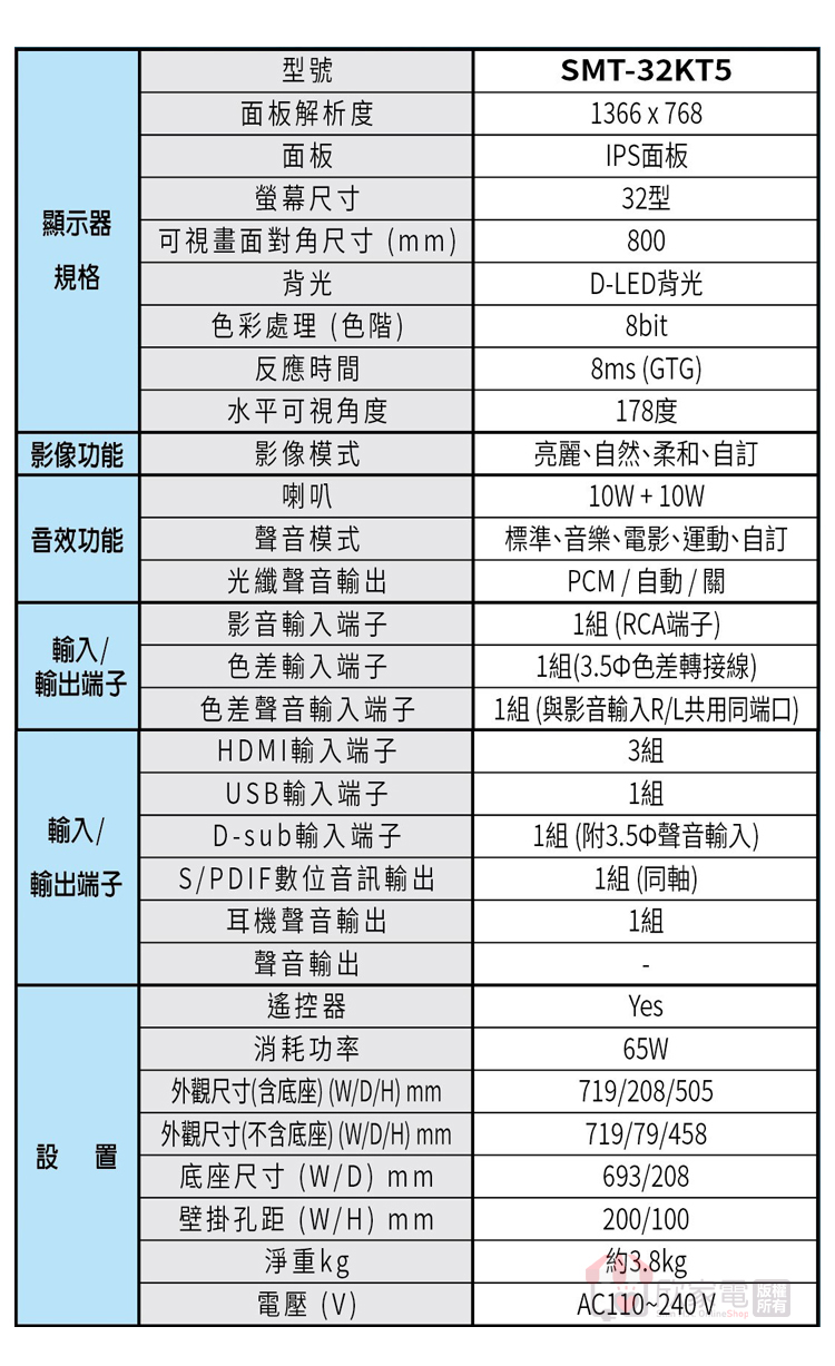 外觀尺寸(W/D/H)(含底座) mm:719/208/505