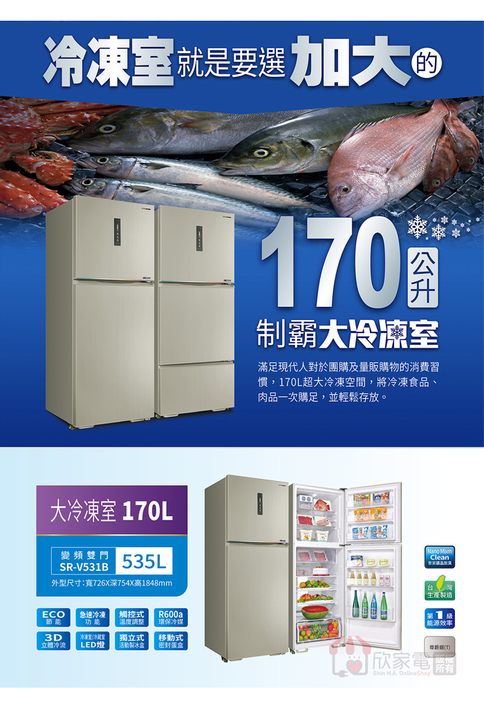 容量:535L (冷凍室 170L/冷藏室 365L)