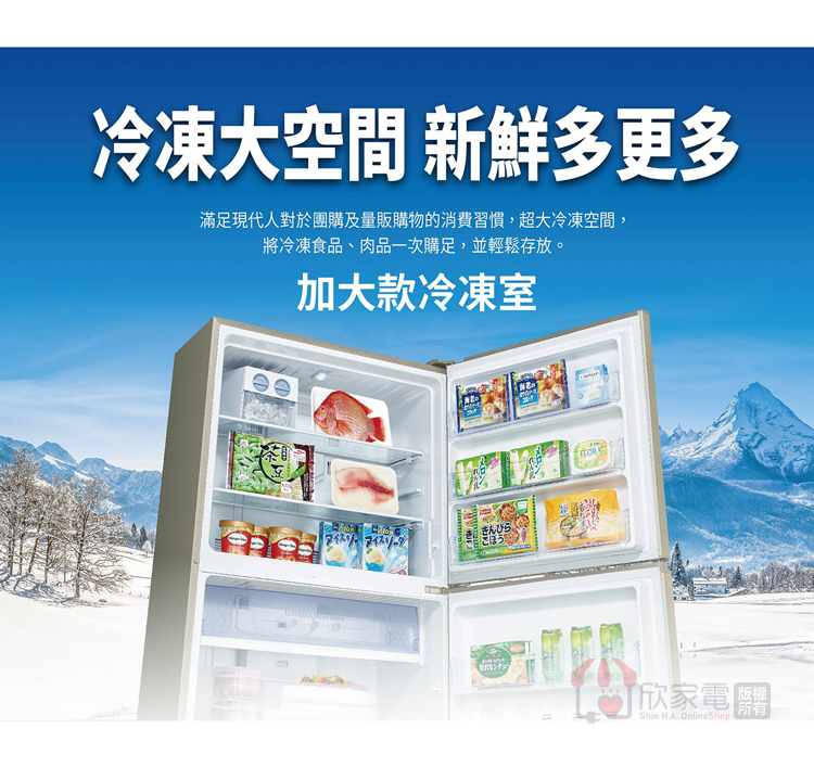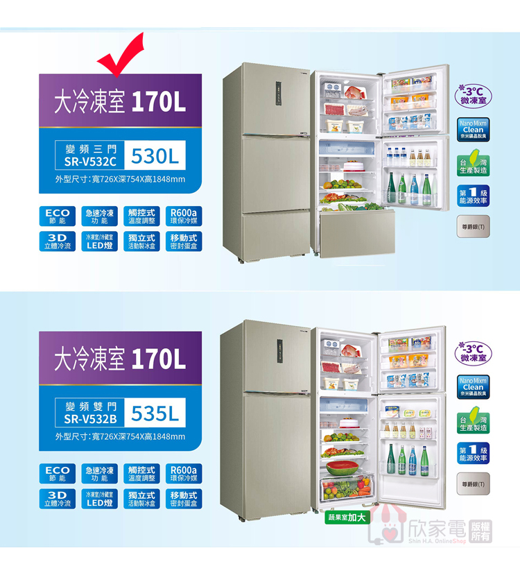 容量:530L (冷凍室 170L/冷藏室 258L/蔬果室 102L)
