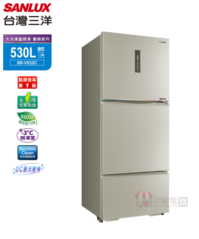 SANLUX 台灣三洋 530公升 -3°C微凍室一級變頻三門電冰箱 -尊爵銀
