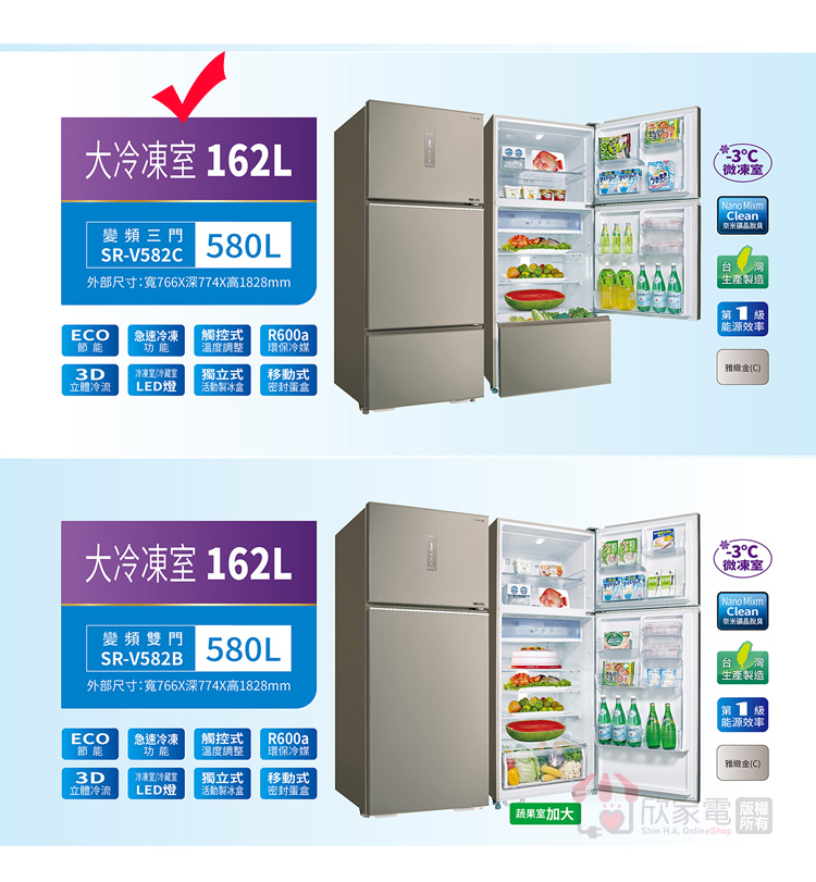 容量:580L (冷凍室 162L/冷藏室 418L)