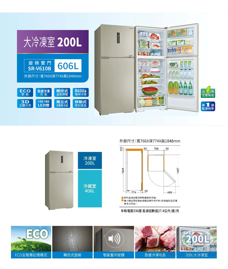 容量:606L (冷凍室 200L/冷藏室 406L)